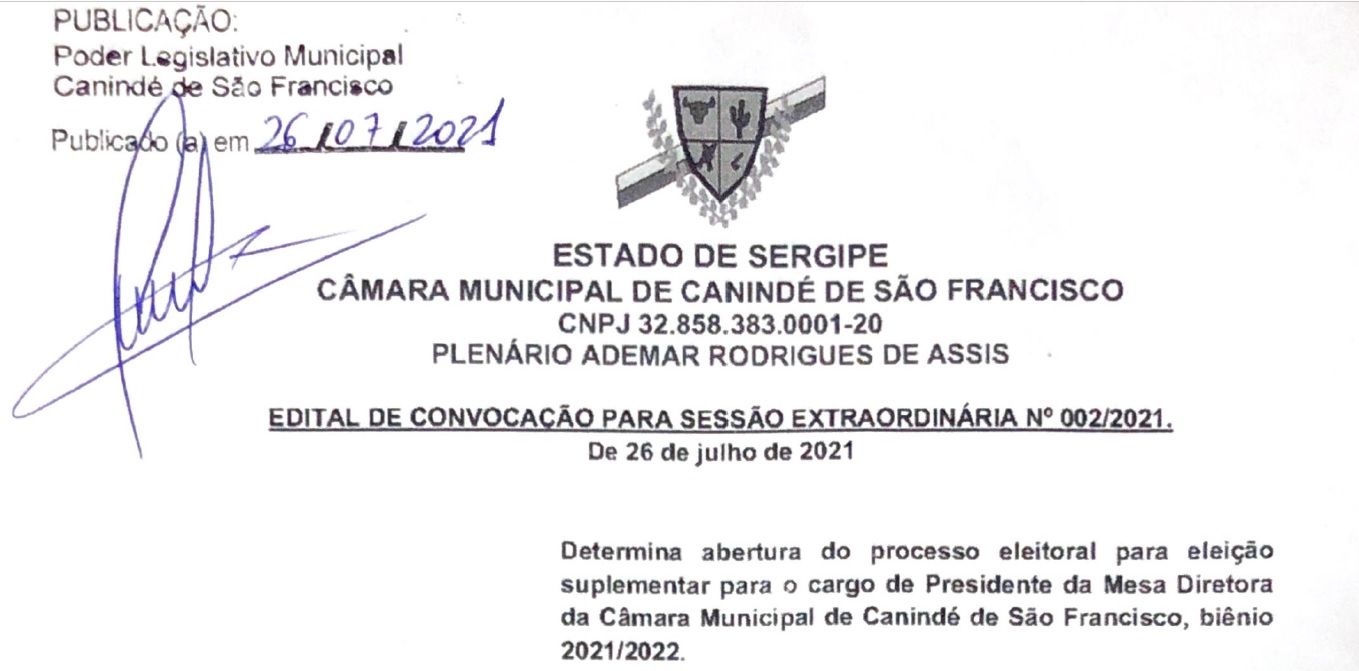 Edital de Convocação para Sessão Extraordinária nº003/2021 – Determina Abertura do Processo Eleitoral para Eleição suplementar para o cargo de Presidente da Mesa Diretora.